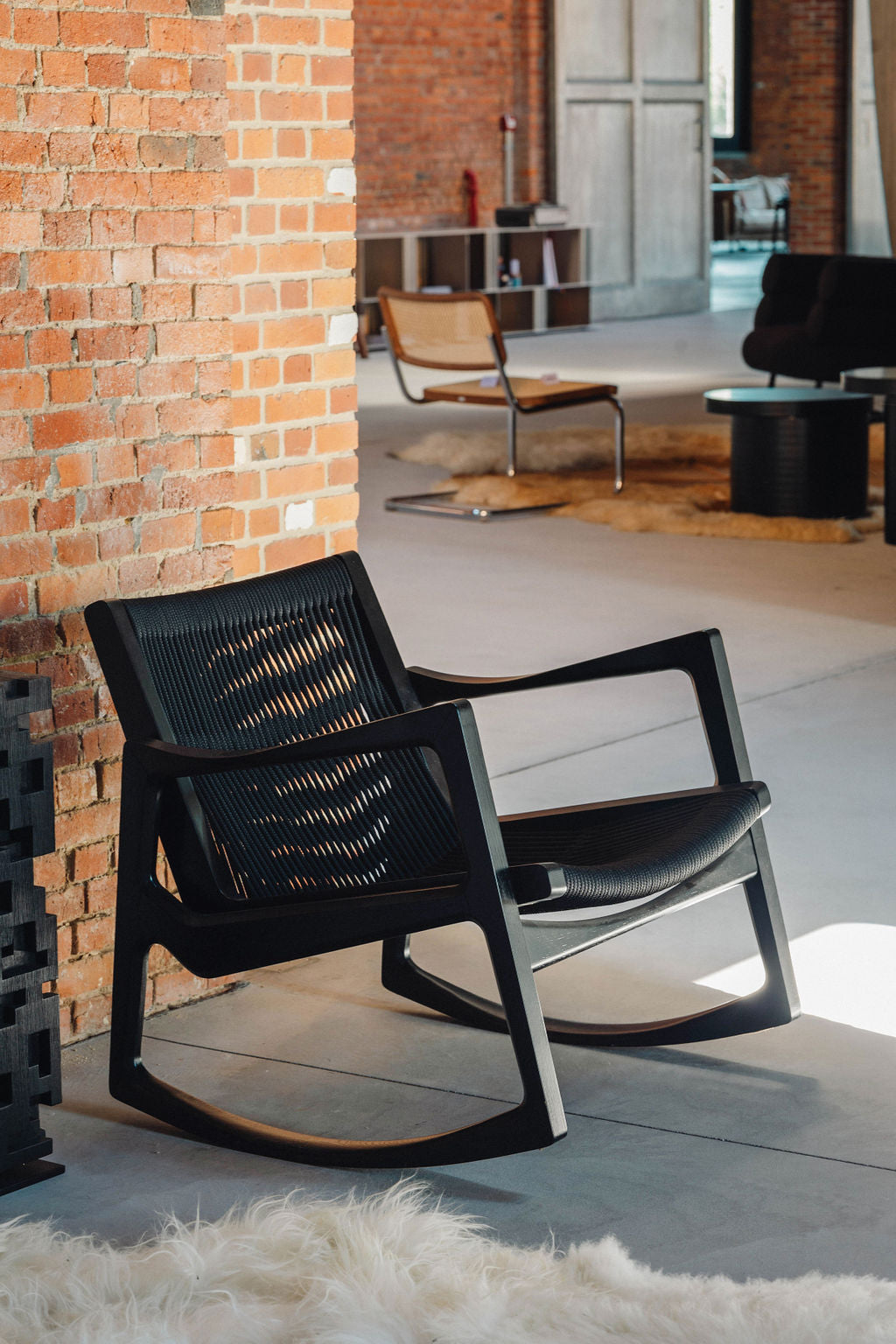 Schommelstoel. Onderstel in zwart gelakt eik, bekleding in zwarte koord.